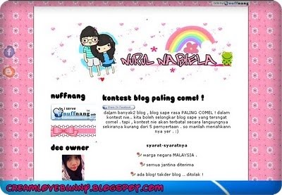 dalam banyak2 blog , blog sape rasa PALING COMEL ! dalam kontest nie.. kita boleh selongkar blog sape yang tersngat comel . tapi , kontest nie akan terbatal secara langsungnya sekiranya kurang dari 5 pernyertaan . so marilah meriahkann nya yer . :)